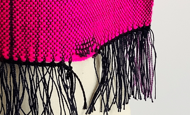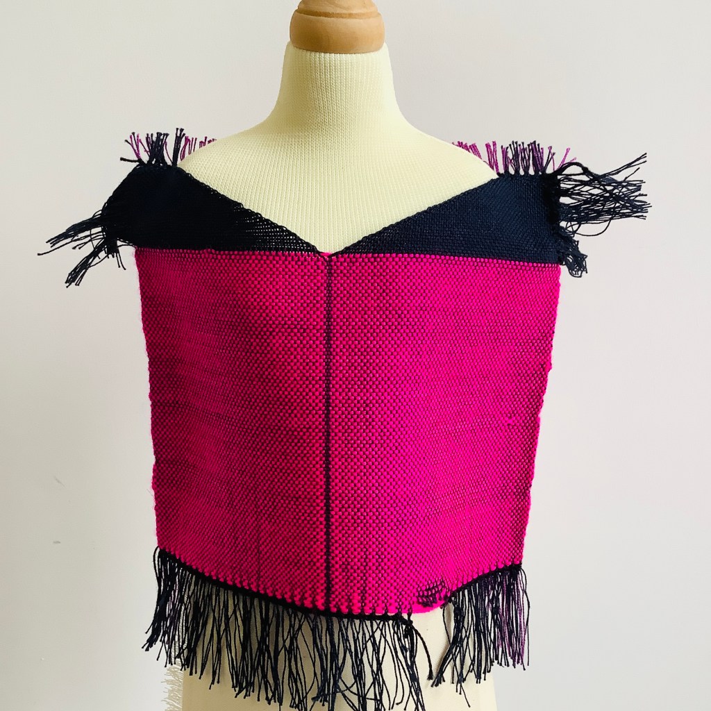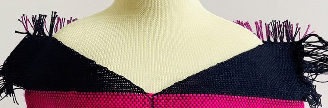 I’m left with the warp ends at the sleeve edges on the top layer which I need to resolve, maybe have them as a fringe or tassels. I may weave the back layer in this section with cut wefts too so I have a fringe to work with on both sides of the armhole.