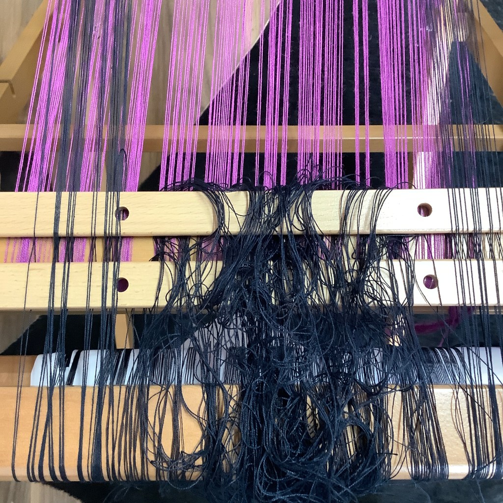 The process was simple and quite quick BUT what a mess I made at the back of the loom! I had to pull the cut threads out of their heddles to stop them tangling and interfering with the shed, so they needed rethreading after I had cut the weaving from the loom, luckily I had kept the cross sticks in so it wasn’t too difficult.